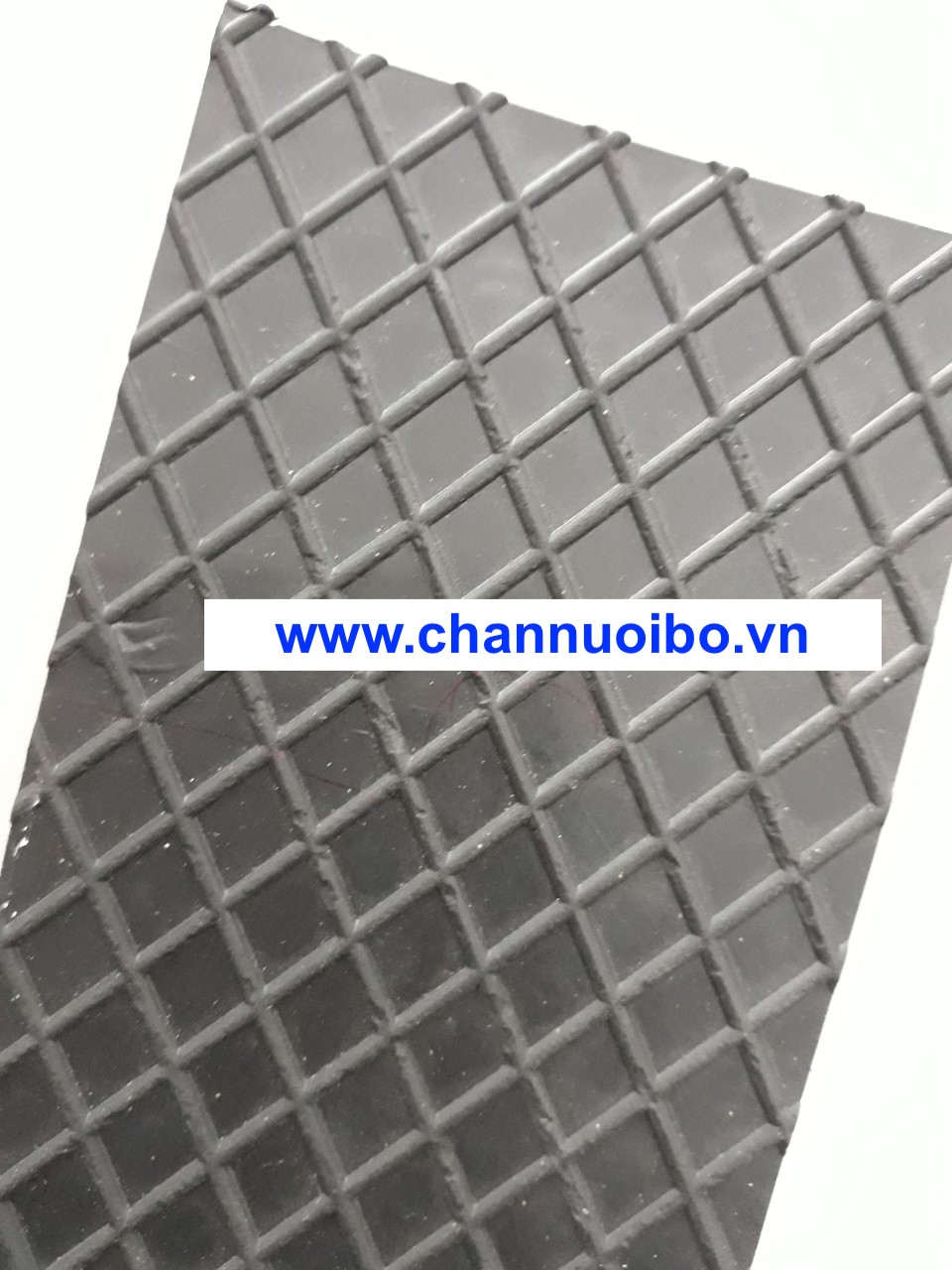 Tấm cao su lót chuồng, chất liệu cao su đã được gia công với độ bền cao, chịu được sự dẫm đạp thường xuyên. Tấm cao su được gia công với mặt trên là những vân nổi hình thoi giúp tăng độ bám, đồng thời giảm trơn trượt khi di chuyển trên thảm. Kích thước: dày 10 mm, chiều rộng và dài cắt đủ diện tích 76 m2.