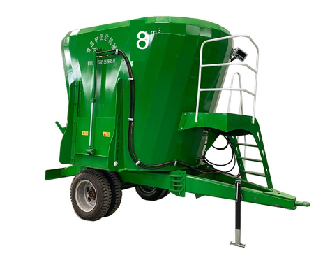 Máy trộn TMR - Forage Mixer, Model FM8 dùng với đầu máy kéo (di động). Dung tích bể trộn 8 m3 Có bánh xe di chuyển, khoảng cách giữa 2 bánh xe 1,6 m, cỡ vỏ xe: 650-10, bên trong có dao băm cắt nhỏ thức ăn thô xanh, trục trộn, tốc độ trộn 15 phút / mẻ, cửa xả thức ăn, độ cao cửa xả 650 mm. Khối lượng máy 1600 Kg, Kích thước (không bao gồm đầu máy kéo): 3.358 × 2.050 × 2.350 mm, Phù hợp với các đầu máy kéo có công suất trên 45 Hp. Bảo hành 1 năm. (giá bán không bao gồm đầu máy kéo)
